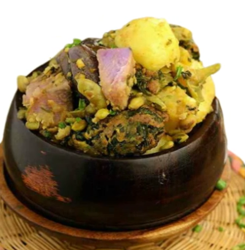 fresh green vegetables, herbs, and spices is meticulously layered and slow-cooked in a matlu